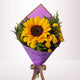 Arreglo con un girasol, variedades y follaje. Decorado con envoltura fina