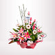 Arreglo con rosas importadas, lilliums, gerberas, fino follaje y delicados zapatitos para bebe.