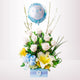 Arreglo de nacimiento para niña con zapatitos tejidos a mano, lilliums y globo BB