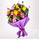 Ramo de girasoles en fino follaje (achileas, silver dollar) y envoltura. Altura 65 cm Ancho 30 cm